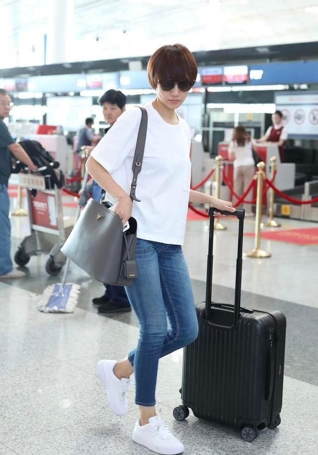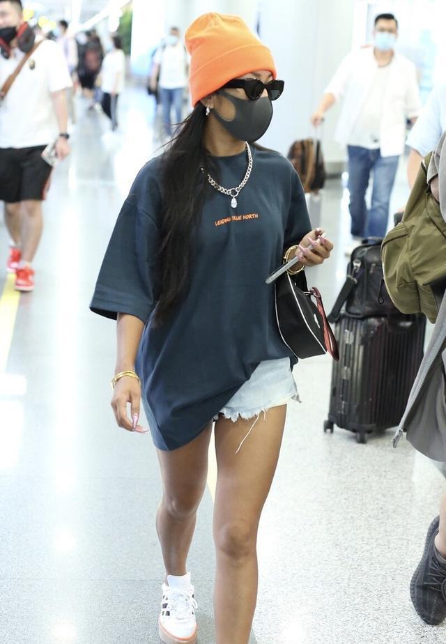 走歐美路線的吉克雋逸,平時機場造型也有眾多T恤look,不過她的路線和殷桃、袁泉那種優(yōu)雅大方的極簡風不同,而是更潮范個性,更多不是選基礎(chǔ)款T恤,像這種oversized版型T恤,可以輕松凹出酷girl街頭范。搭配運動褲或者直接玩下衣失蹤穿法,都是非常酷的風格,在健美膚色襯托下格外國際范。