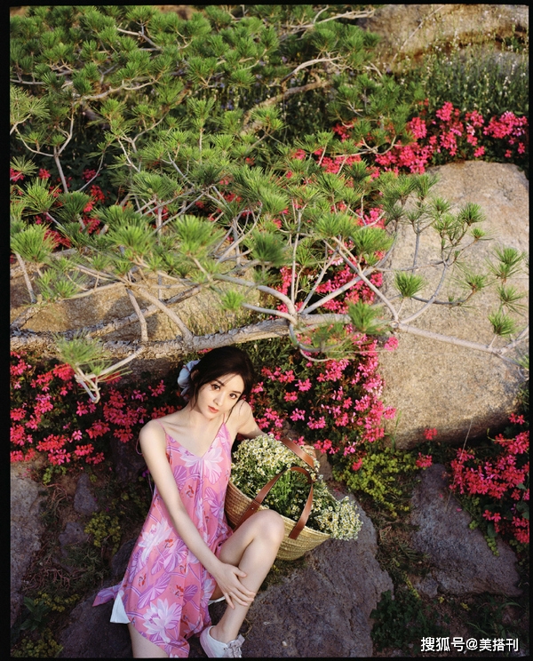 粉裙長度也很短,剛剛能蓋過大腿,趙麗穎這么蹲在大石頭上,露出了纖細的美腿,腳上是小白鞋,造型清涼嫵媚不失休閑。由于粉裙有點短,不太安全,所以裙子里面又搭配了一款白色短褲,短褲若隱若現,白色短褲和鞋子中和粉色的甜膩,帶來幾分清新。趙麗穎的發型偏隨意,盤成一個低發髻,額頭兩邊的劉海略微有些凌亂,不經意的撩人。