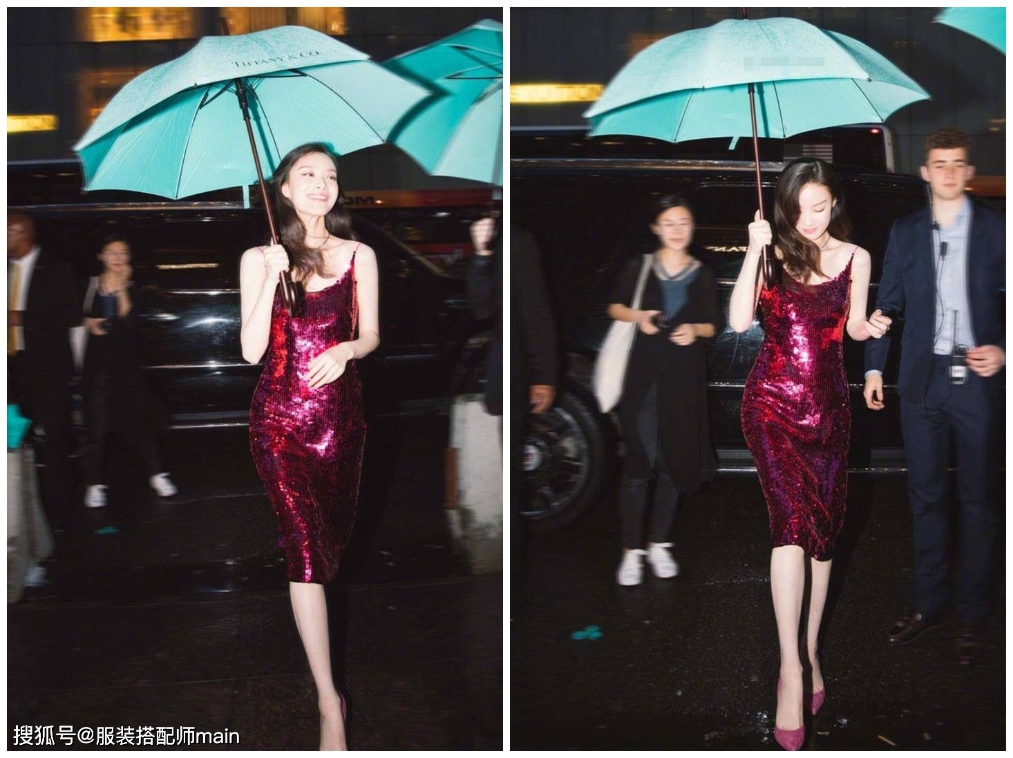 而最讓我印象深刻的則要屬她參加活動時穿一襲玫紅色亮片裙的樣子了,紅裙配卷發妖嬈嫵媚,單手撐傘更有美感,畫面中的倪妮有點九十年代香港電影明星的味道了,風情萬種,真是美絕了!