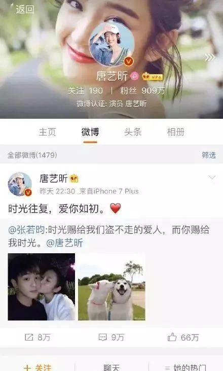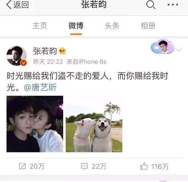 2017年8月2日晚,張若昀發博公布戀情“ 時光賜給我們盜不走的愛人,而你賜給我時光”。唐藝昕回應 “時光往復,愛你如初”。