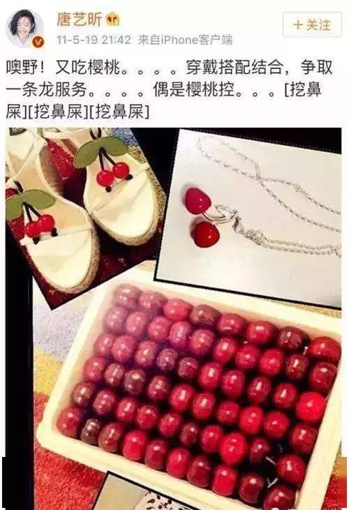 尤其是第一句 “她愛吃櫻桃,笑起來很甜”。恩,唐藝昕確實愛吃櫻桃,笑起來也很甜。唐藝昕在劇組拍戲,張若昀還一箱一箱的往劇組寄櫻桃呢。