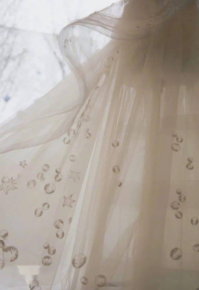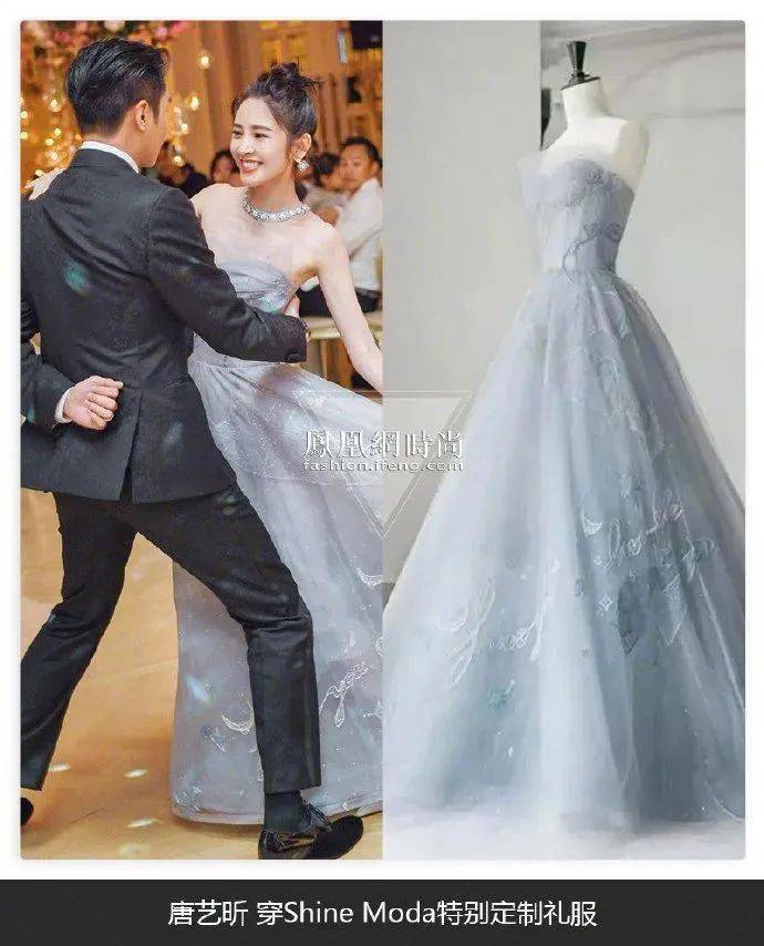 唐藝昕的婚紗取名為“燦若繁星”,“若”和“星”取自于張若昀和唐藝昕名字中的諧音,星空和泡泡是唐藝昕最愛的元素,就如他們的愛情在每一個累積的點滴里,都能感受到如銀河海洋般濃濃的愛意。