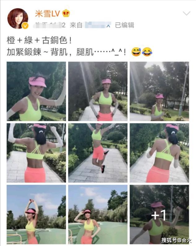 10月11日,港星米雪在其個(gè)人社交平臺(tái)賬號(hào)上發(fā)出一組照片,并配文:"橙+綠+古銅色,加緊鍛煉背肌、腿肌。"