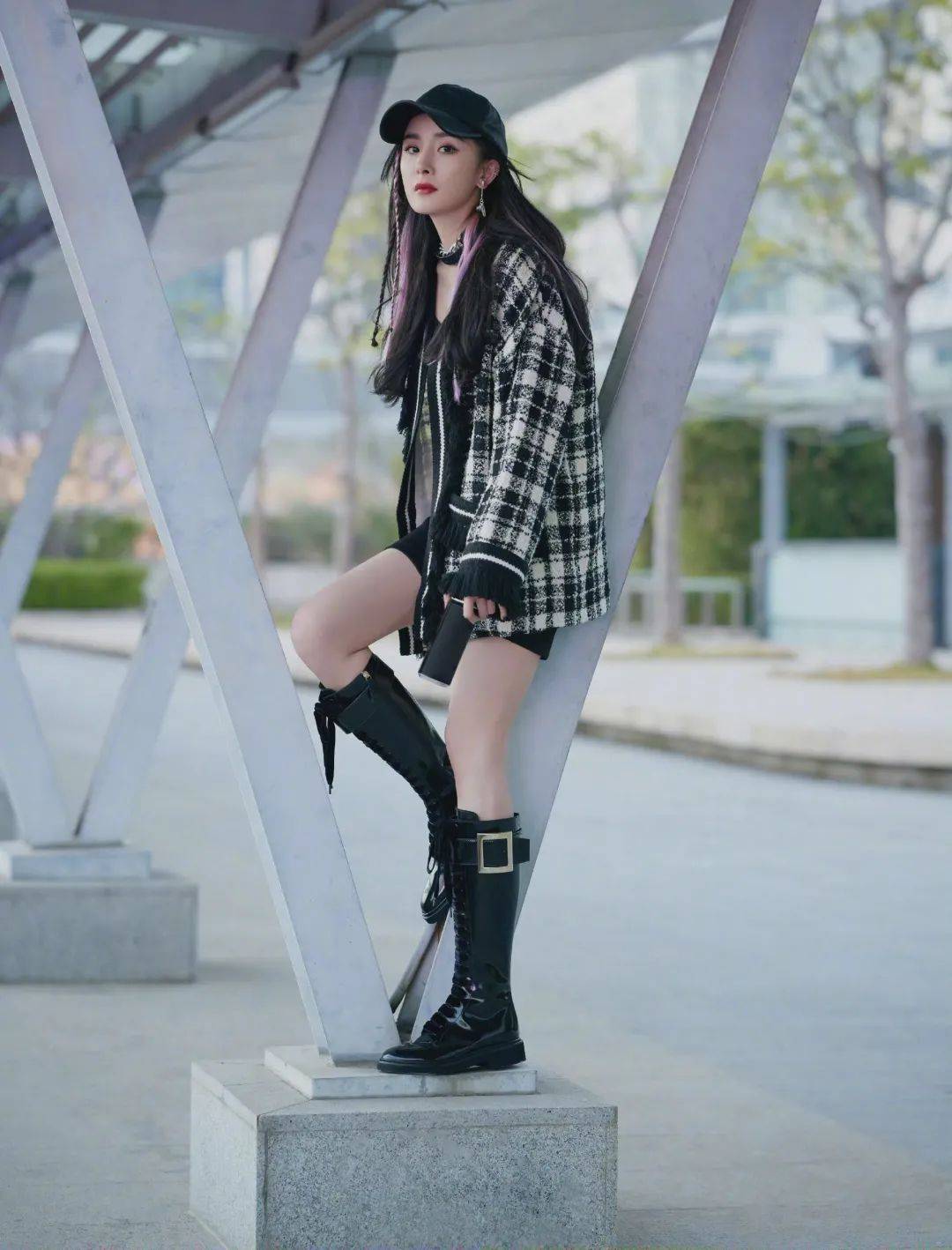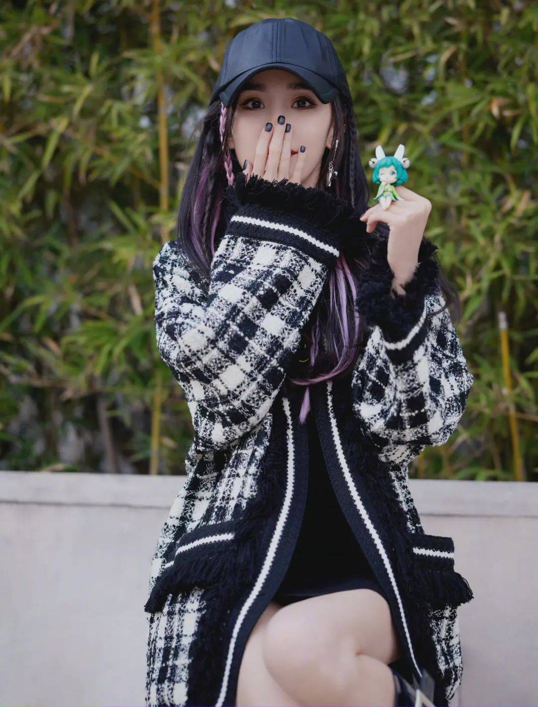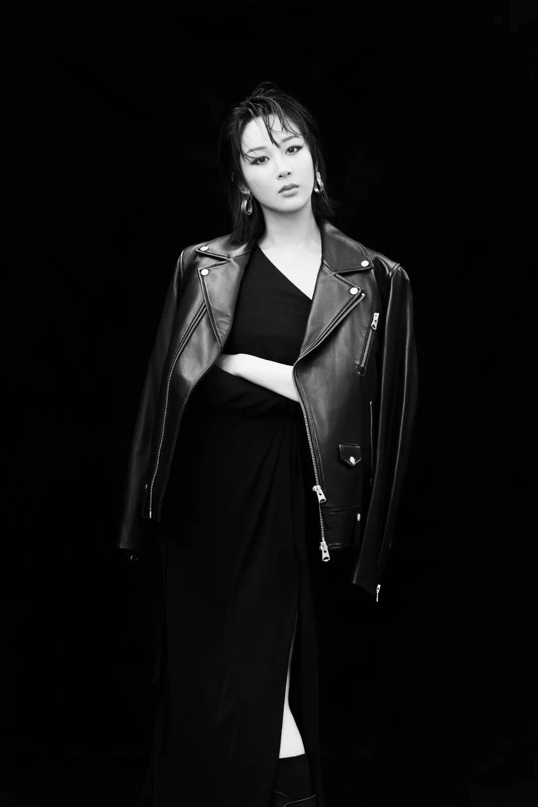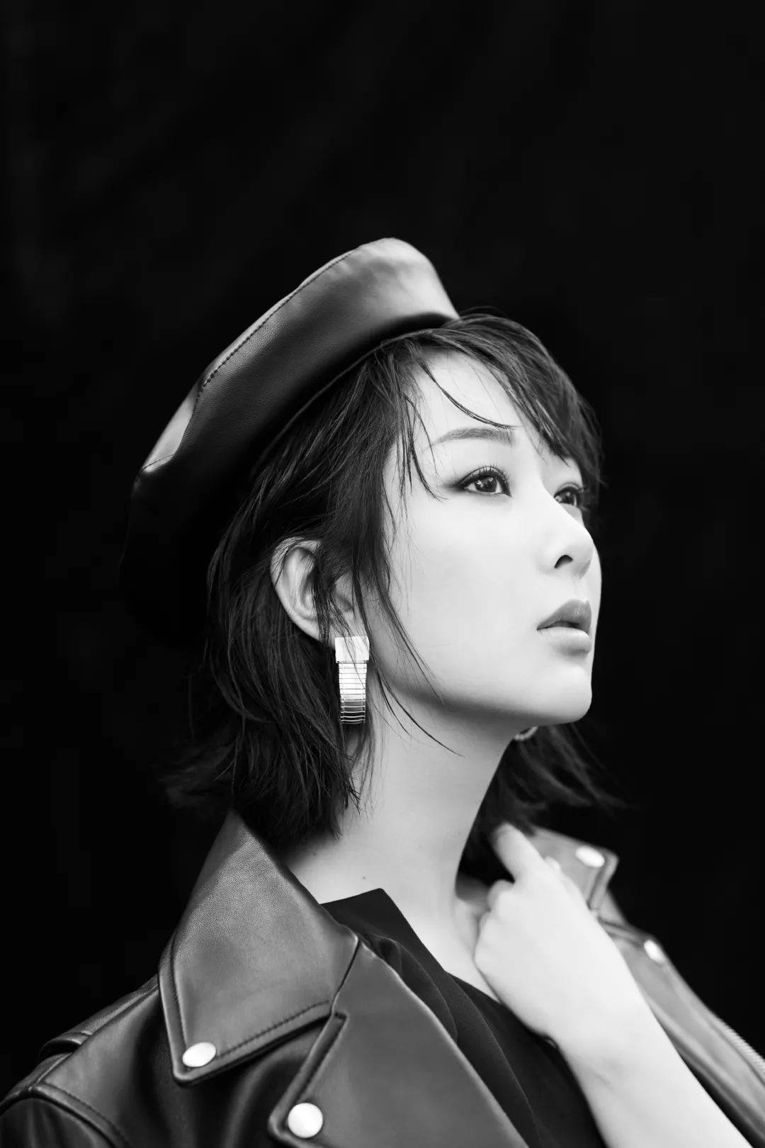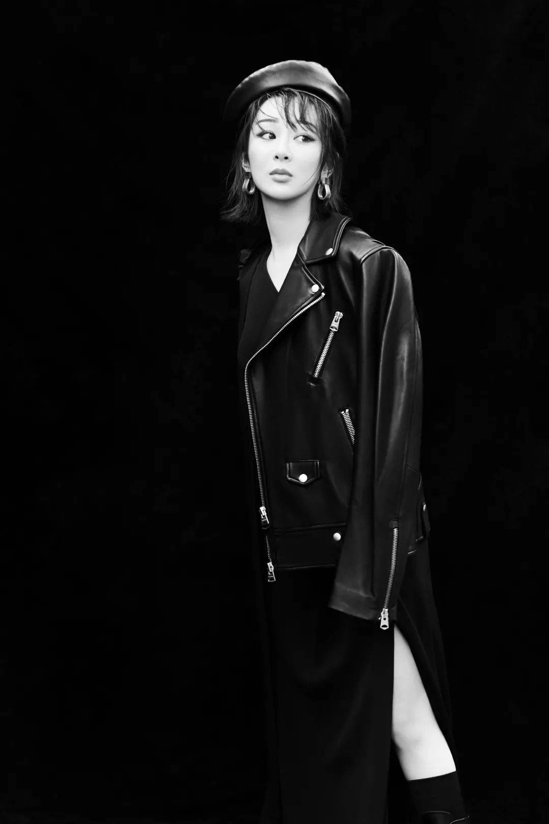 ▼?楊紫全新大片公開,黑色皮衣搭配復古貝雷帽和斜邊高開叉長裙,在黑白光影之間呈現簡約又高級的美感。