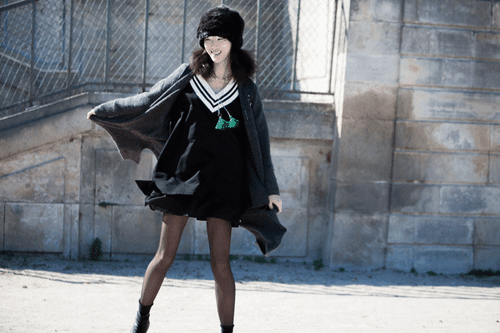 俏皮可愛的,這一身韓國女團風的小風衣造型,雖然仍舊一身黑,但配上畫家帽,崔素拉難得一見的甜美笑容,展露出一雙大長腿,夠時尚又夠可愛。