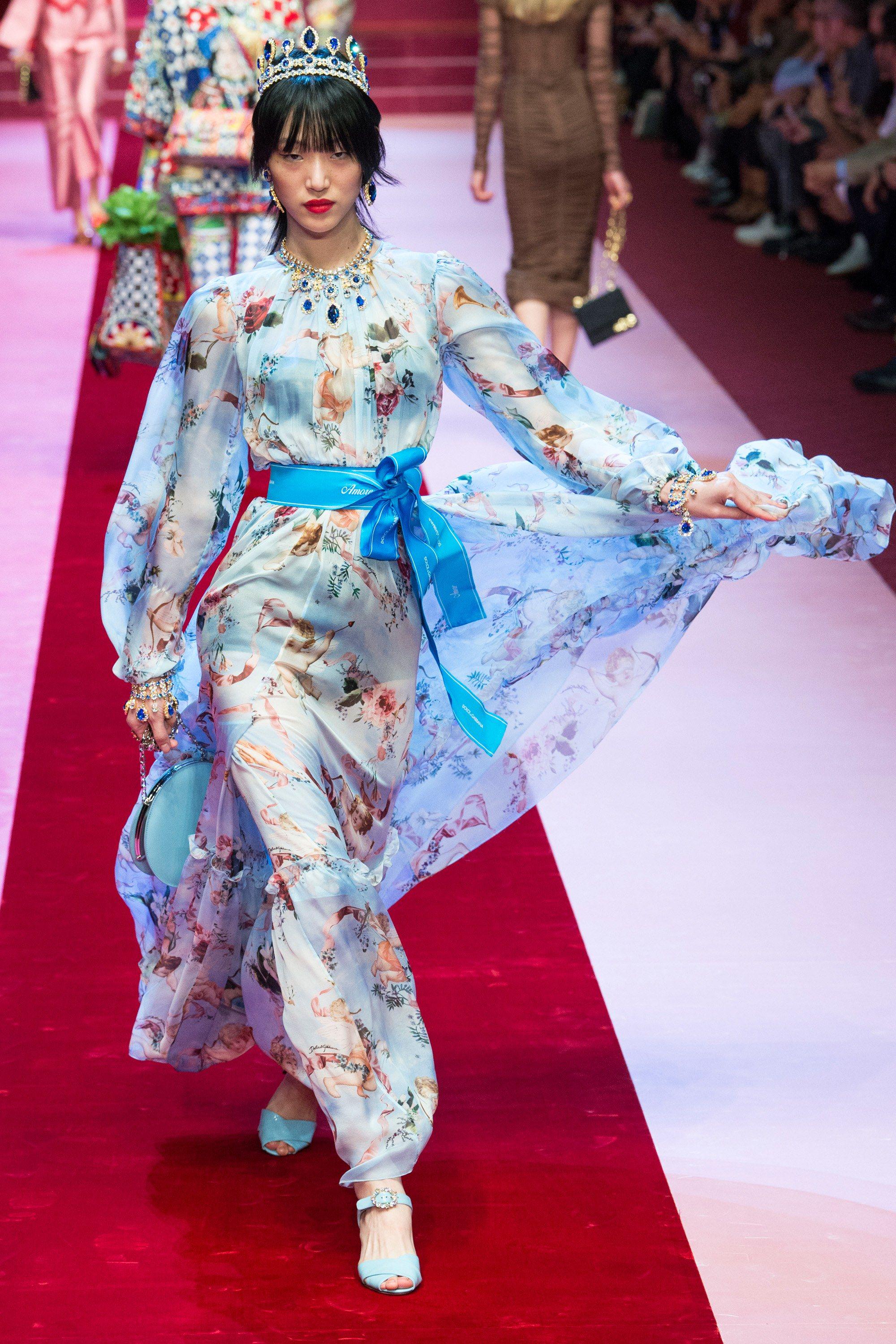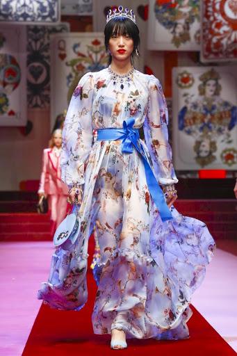 像這一身淺藍印花紗裙,崔素拉明顯水土不服,硬把一個本該走美艷風的模特塞進了仙女風的裙子里,還頂著一頂小公主的鉆石王冠,著實牛頭不對馬嘴。
