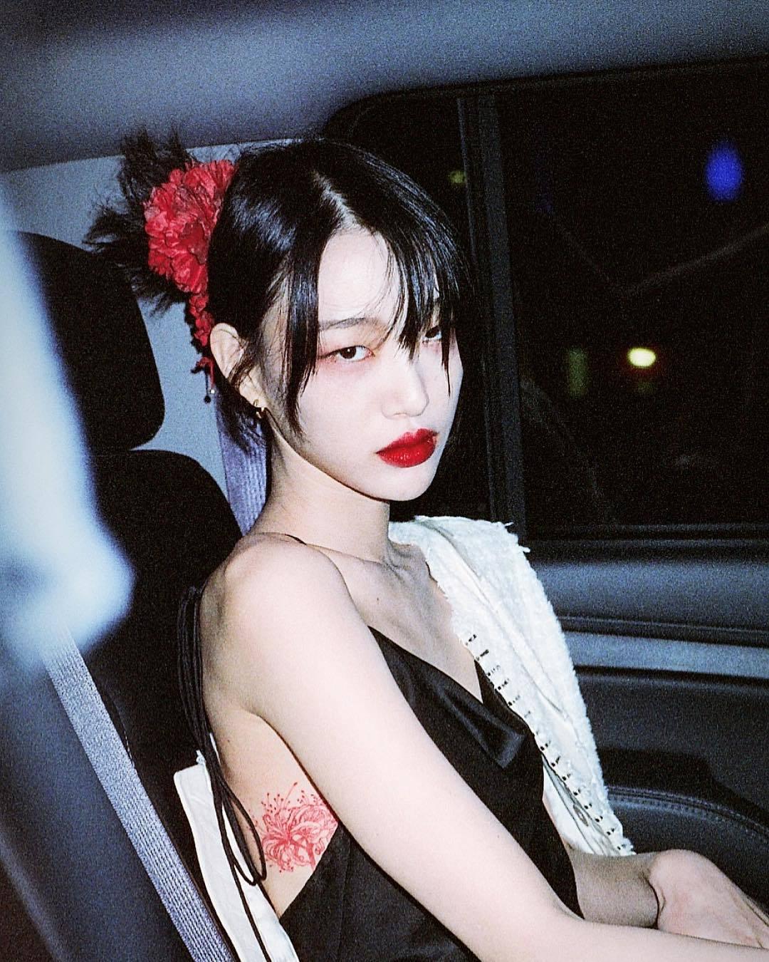 妖艷的,比如這一身簡單的綁帶絲綢裙,露出背脊上的彼岸花紋身,紅唇驚艷,性感外露,還有幾分與韓國女星雪莉相似。