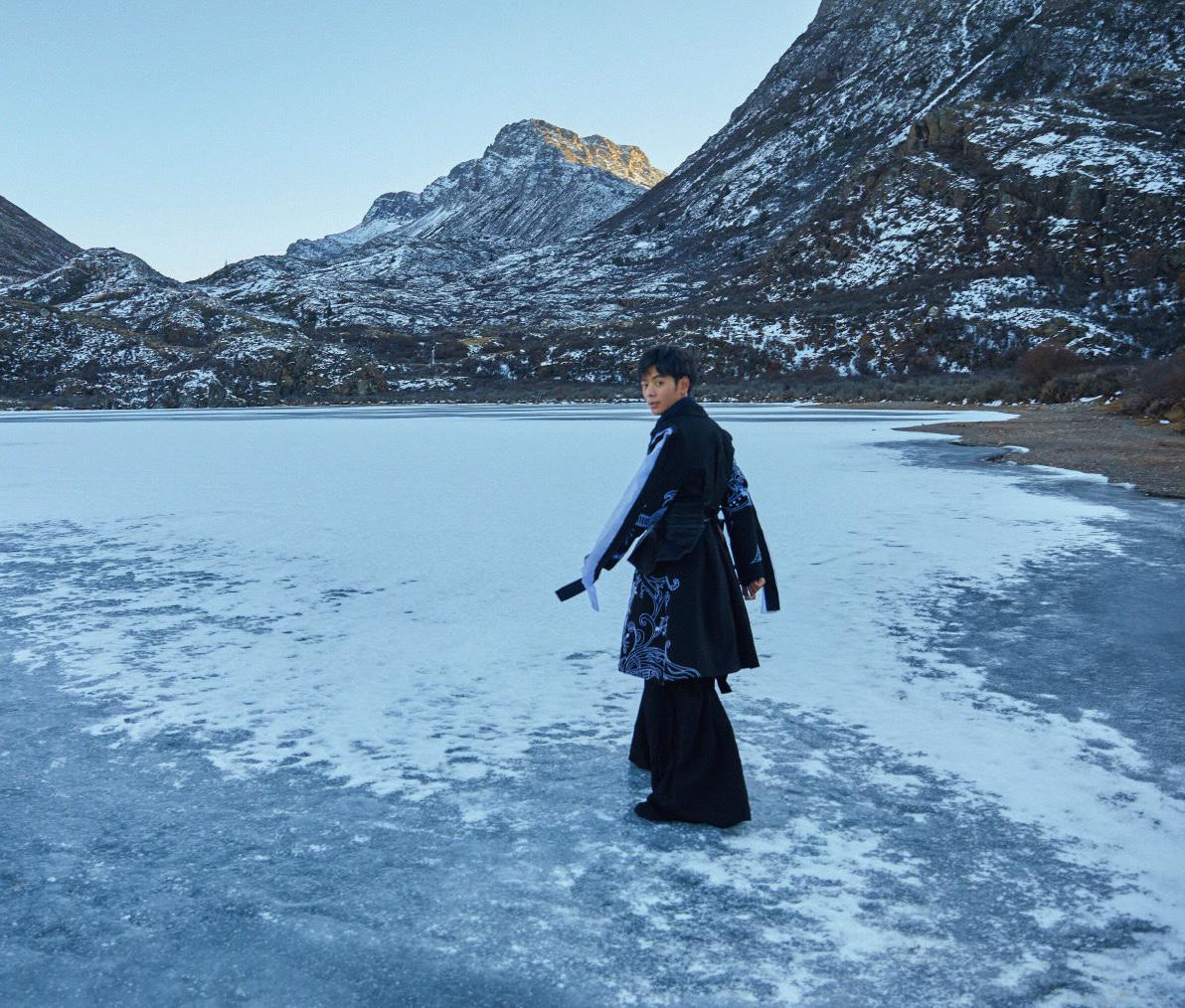 妝造組還特地給丁真挑了一套充滿古風設計的服裝。上衣是一件黑色的刺繡長袍,上面有著多層結構設計,行走間衣服上的長條隨風擺動,自帶瀟灑帥氣。下半身的超大擺長褲襯得丁真個子高挑,在雪地上行走的丁真像是從古代穿越而來。