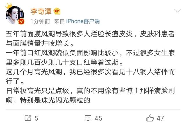 在顏值當道的時代,化妝似乎已經成了當代年輕人一項必備技能,這時很多所謂的美妝博主崛起,然而他們畸形的網紅審美讓很多女生“誤入歧途”,妝容夸張且千篇一律。對此,李奇潭用犀利的文字點評該現象,他更是把胡亂用高光的人形容成“十八銅人”,令人忍俊不禁。