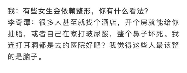 在大多數人看來,化妝已然不能滿足他們的需求,只能依賴整形重塑自信。對此李奇潭犀利評價道,有些人隨便找設備簡陋的工作室整容,如果手術失敗都是咎由自取。雖然言辭刺耳,但很在理。