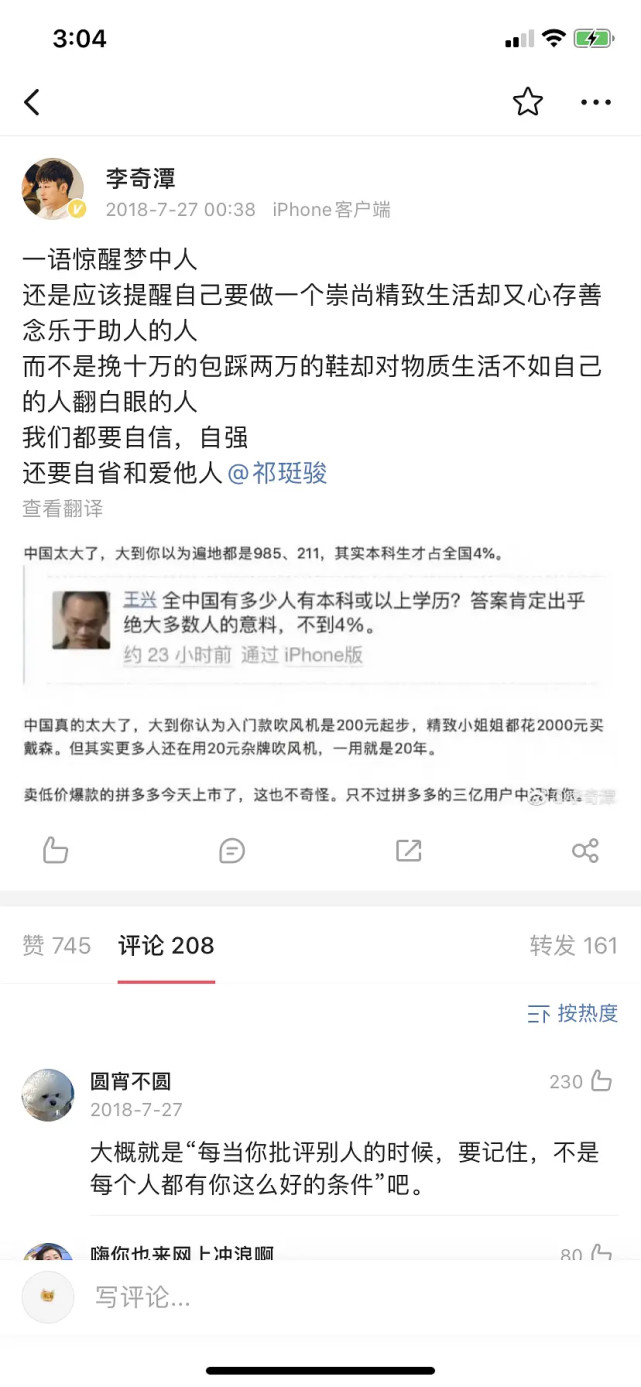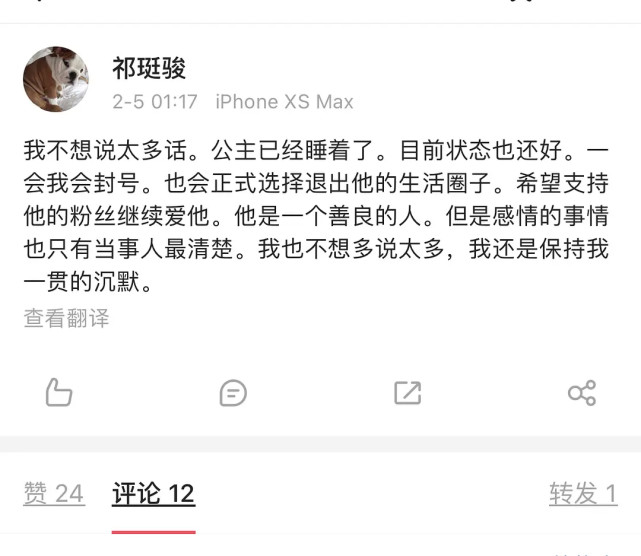 2月5日凌晨,祁珽駿終于發聲,他把自己回歸為李奇潭粉絲的身份:“我不想說太多話,公主已經睡著了。”祁珽駿宣布分手,承諾他會退出李奇潭的圈子,并稱贊李奇潭是一個很善良的人,最后祁珽駿表示他選擇沉默希望大家不要妄自猜測。