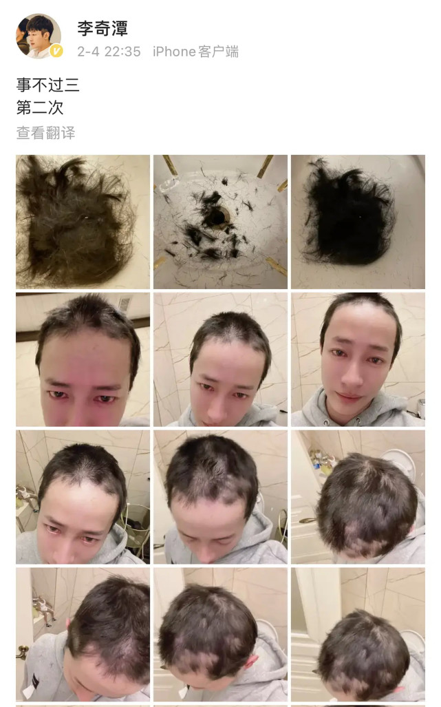 然而,再相愛的情侶也免不了分手,2月4日深夜李奇潭在社交平臺分享了自己剃頭的過程,因為技術不嫻熟,他把自己原本帥氣的短發剃成“斑禿”的既視感,碎發散落一地,畫面傷感。