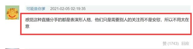雖然分手的過程有些狗血,大家隔著屏幕都能感受到當事人的傷痛,但也有的網友表示:“感覺這種直播分手的都是表演型人格,他們只是需要別人的關注而不是安慰,所以不用太在意。”