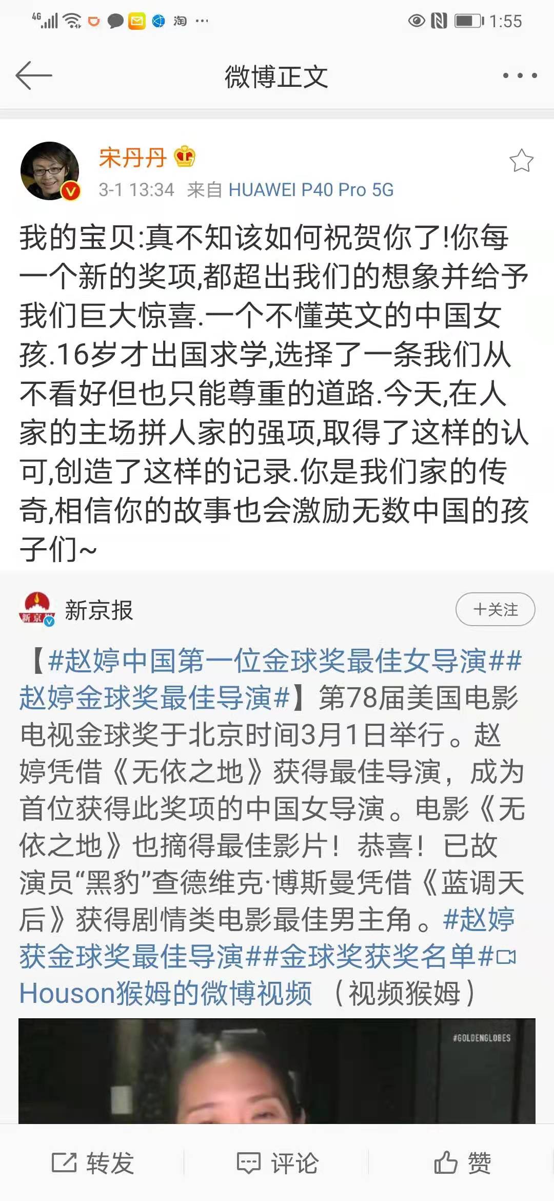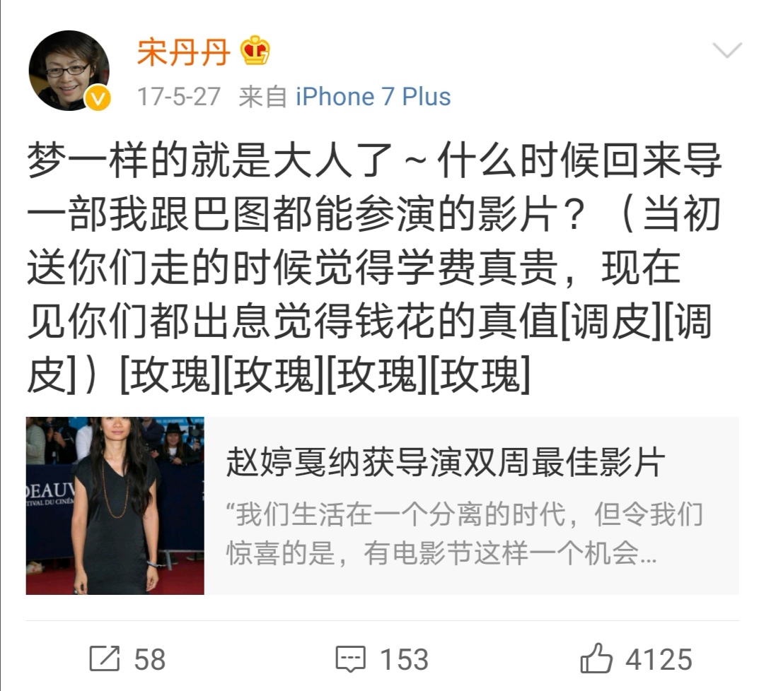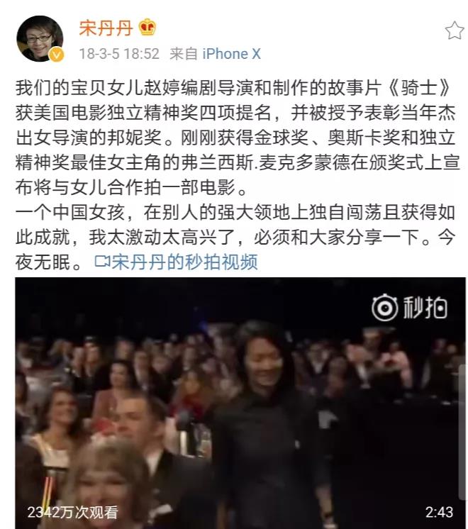 趙婷還有一個(gè)離中國網(wǎng)友更近一點(diǎn)的身份——演員宋丹丹的繼女,丹丹老師曾多次發(fā)微博贊譽(yù)她的優(yōu)秀。