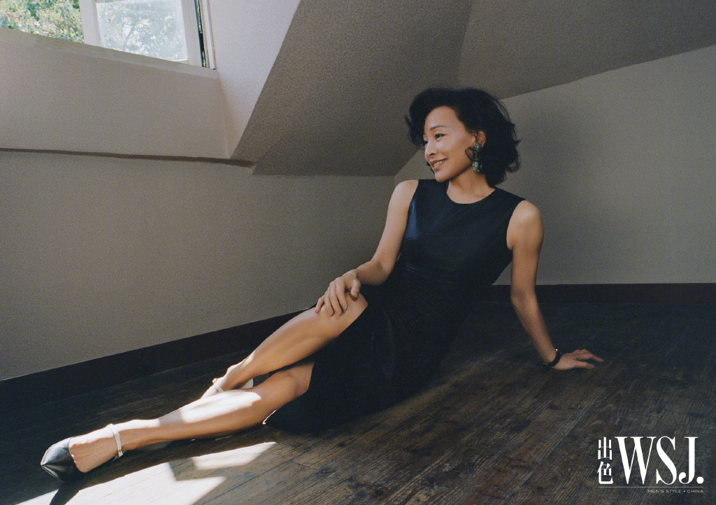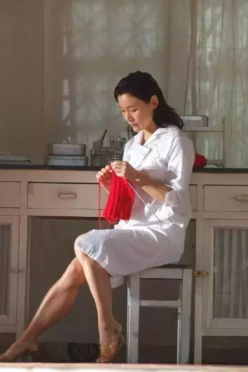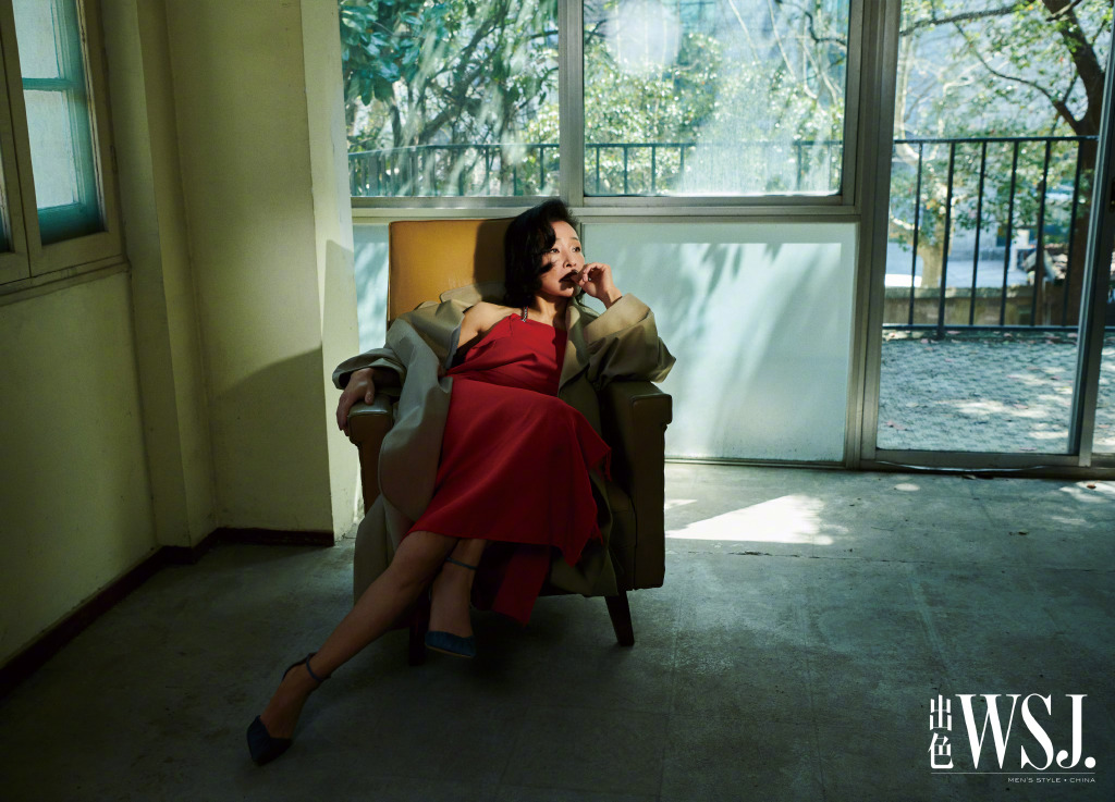 空曠的房間內充滿夏日氣息,陳沖身穿紅色連衣裙癱坐在椅子上,帶著慵懶的feel,從容又灑脫的姿態讓整個畫面充滿電影質感。