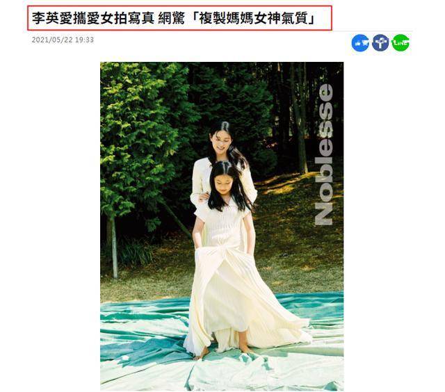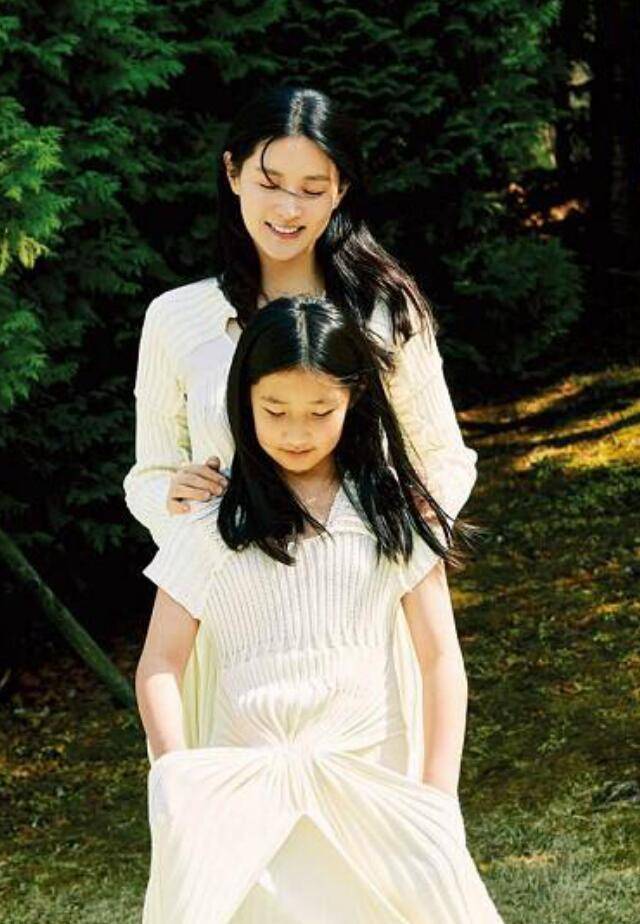 母女兩人雙雙穿著白色飄逸長裙,赤腳拍攝,可以看出女兒的身高已經快和媽媽差不多了,跟媽媽李英愛一樣留著披肩長發,跟媽媽一樣的烏黑長發,鵝蛋臉型,圓圓的蘋果肌,低頭莞爾一笑,有種少女的溫柔,在微風的吹拂下白色裙擺飄向一邊,媽媽靠在女兒身后,雙手輕輕扶在女兒肩膀,溫柔的母性光輝越發耀眼。