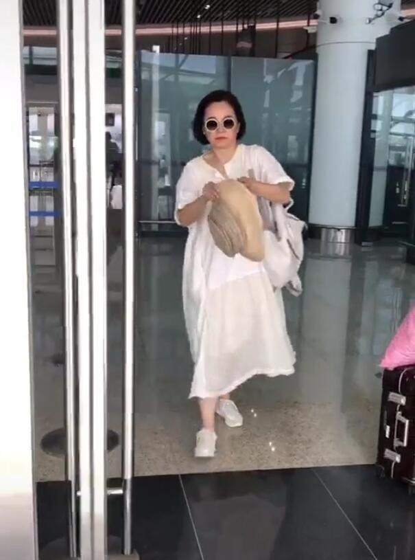 穿上這樣一件白色的裙子啊,也還挺不錯的,配上的是那種白色的平底鞋,就顯得落落大方的,她的五官看見別的端正,而且從這個角度看起來,那個圓臉還是非常的可愛的呀,所以一點都不會顯老了。