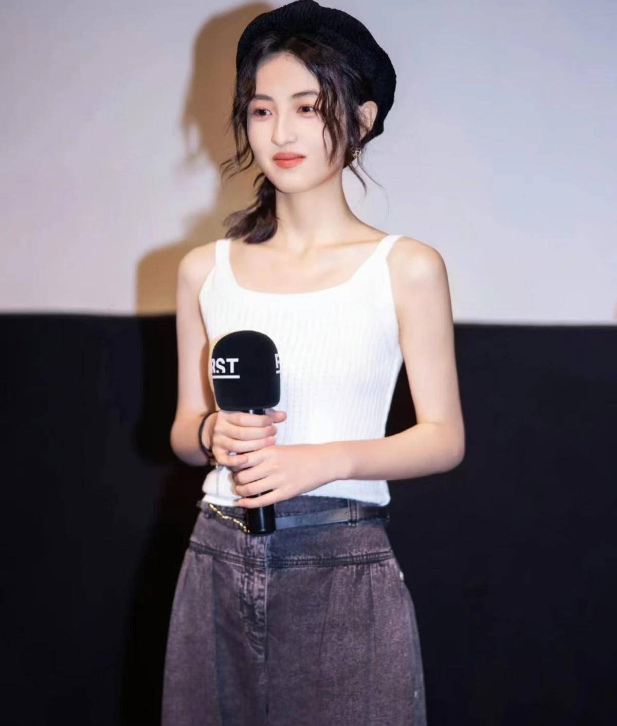 第一身白色的背心搭配牛仔褲和貝雷帽,造型會更時尚和俏皮一些,尤其是貝雷帽和斜馬尾的發型結合在一起,再加上張子楓發型的明顯卷度,讓整個人看上去就更俏皮了,時尚感也更足了。