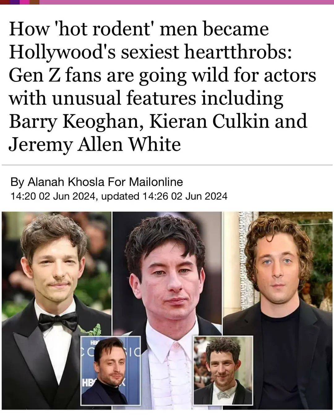 近期,美國社交媒體上新興起一個熱門詞匯——“鼠系帥哥”(Hot Rodent Men),用以描繪演藝圈中新出現的一種男性審美風潮。這一新潮詞匯,究竟是在褒揚還是在貶損呢?事實上,它指的是那些雖然五官并不完美、不符合傳統審美比例,但卻散發著強烈個性魅力的男演員們。