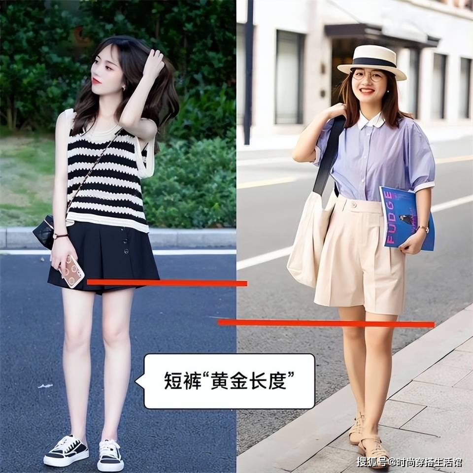 剛好到膝蓋處的中褲會在腿部形成一個階段,好像你的腿部就只有被截出來的小腿那么長,是對小個子非常不友好的一個長度。如果你想穿著中褲還顯高的話,那一定要避開恰好及膝這個讓你腿短又顯腿粗的雷區(qū)長度。
