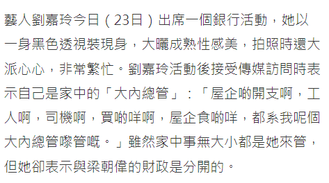 另外她還分享,自己在家里是“大內總管”,家里的一切大小事務都是劉嘉玲在管理的,不過她和梁朝偉的財務則是分開的。