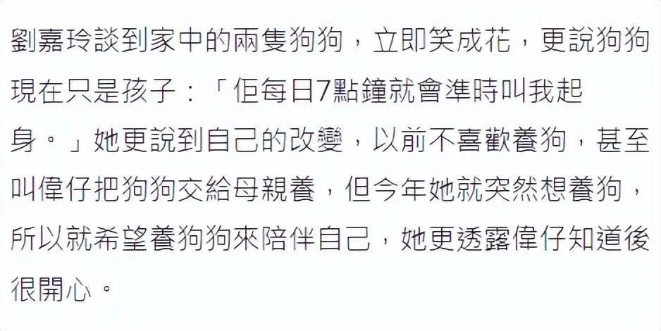 劉嘉玲自己也表示,養了兩只寵物狗之后變得特別開心。