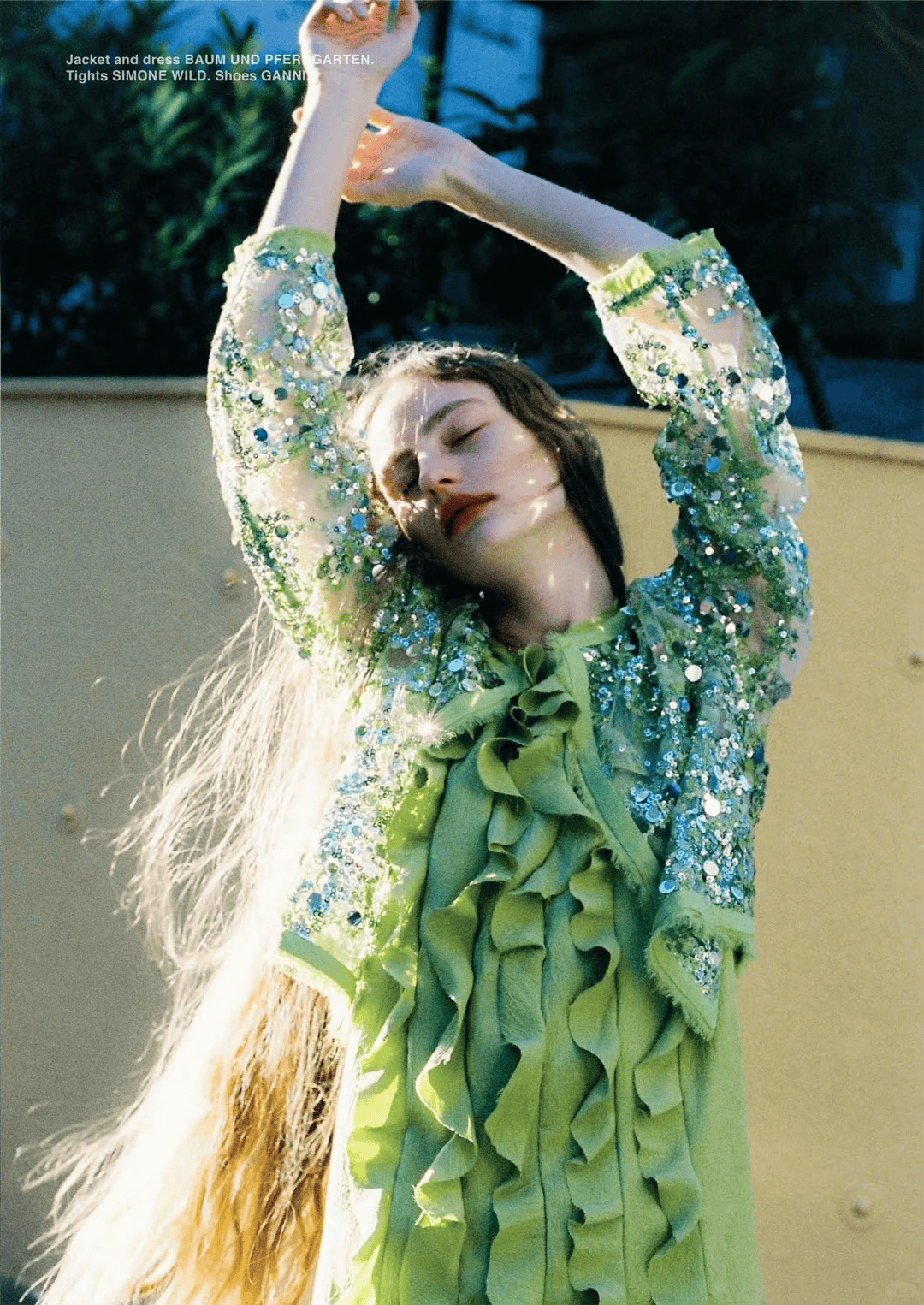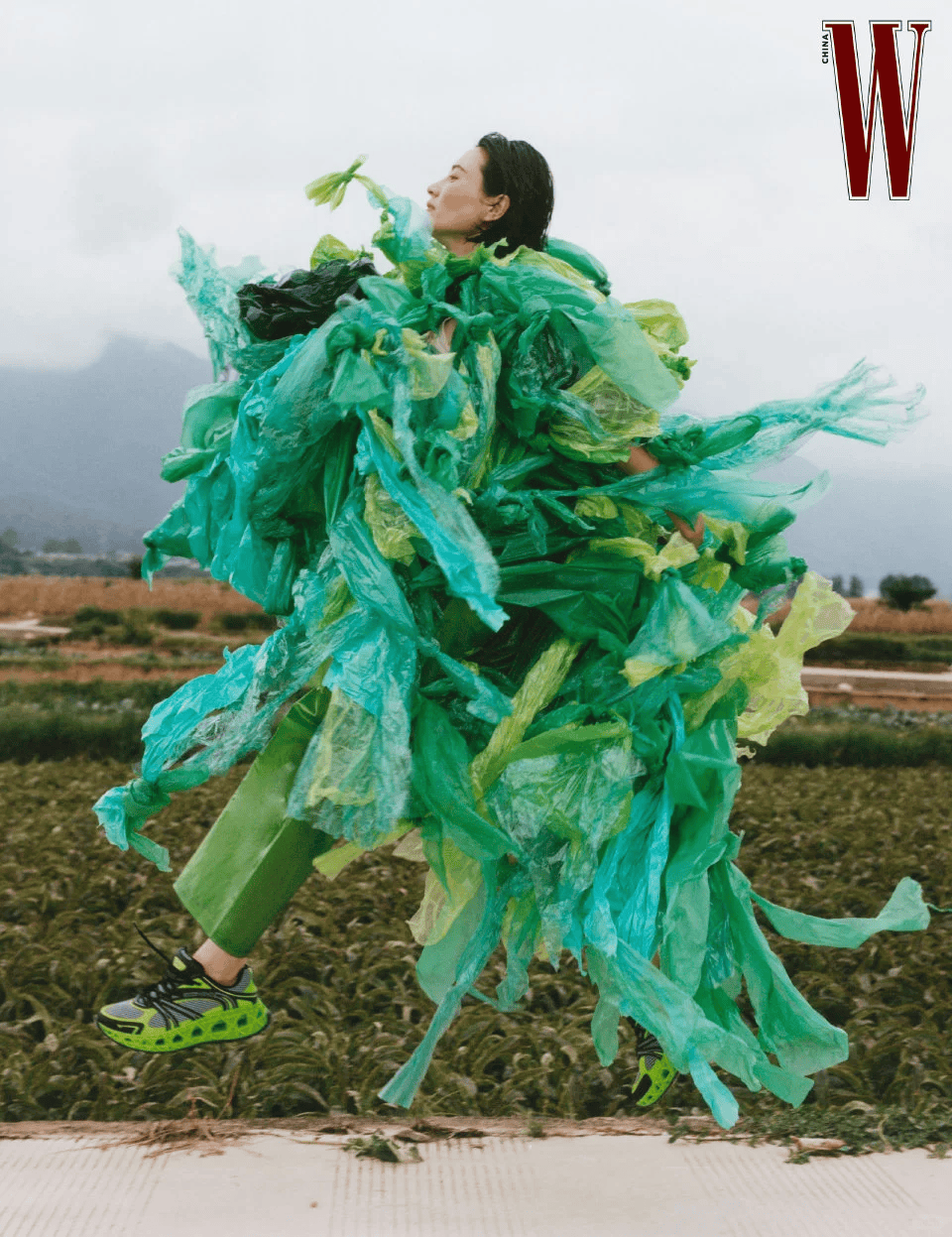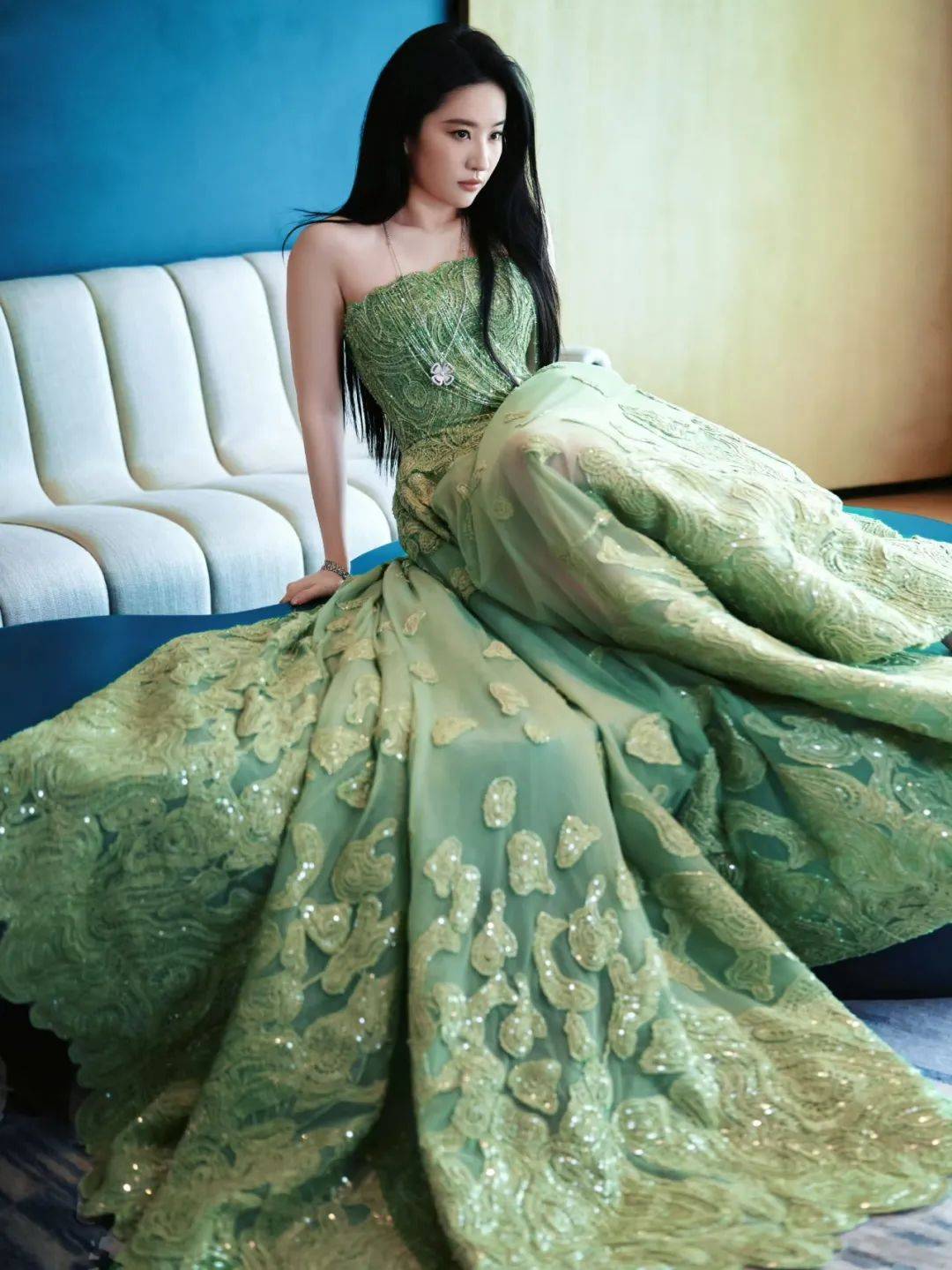 青檸奶油色通過飄逸的長裙與飄搖的輕紗羽衣,