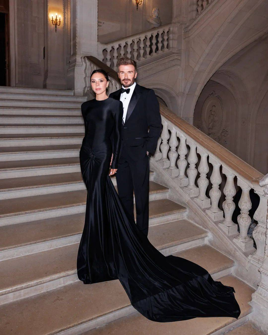 貝嫂一襲黑色魚尾長裙,小貝則是正裝西裝配領結,一絲不茍的正裝Look,完美襯托出他“脫衣有(?。┤?,穿衣顯瘦”的教科書身材~