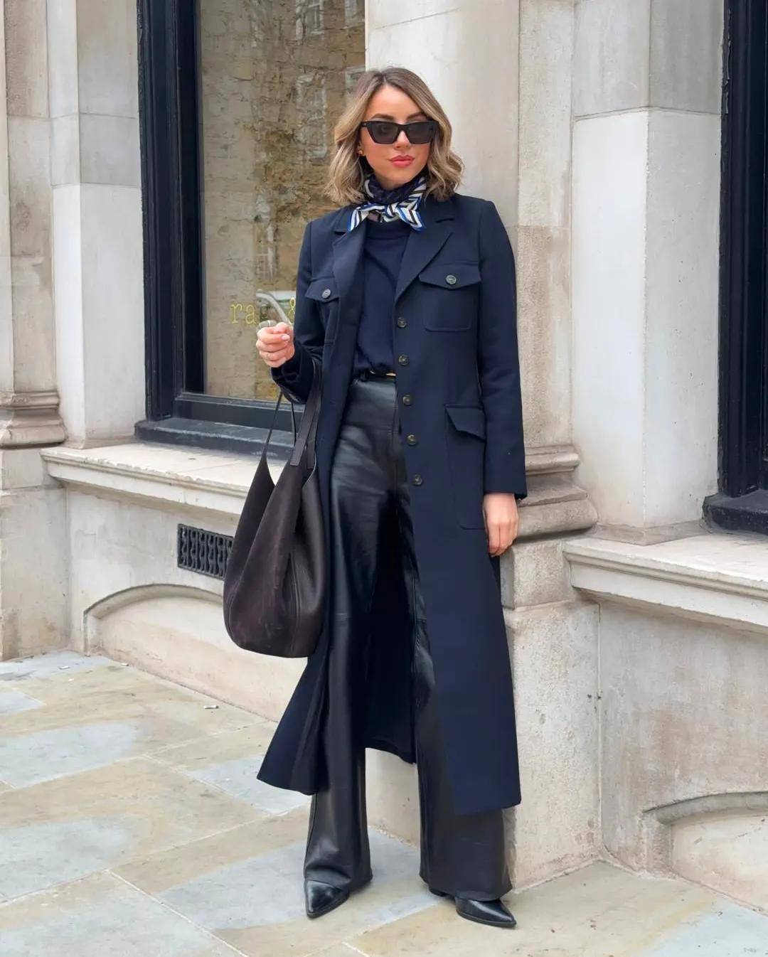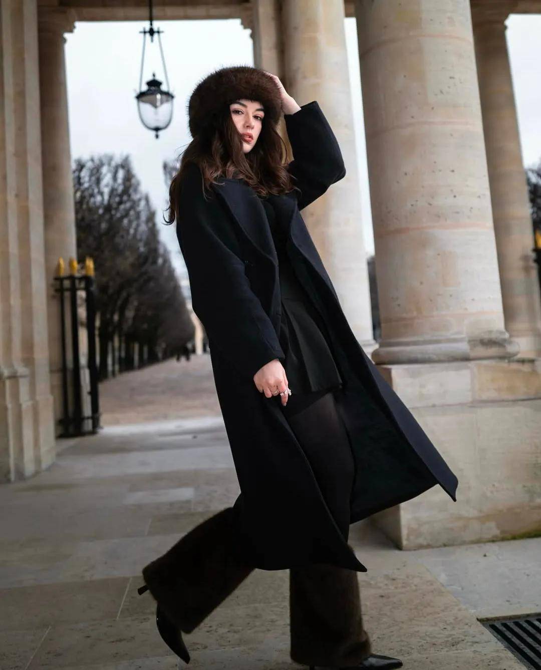 比如黑色H版型的大衣與垂感十足的黑色闊腿褲,
