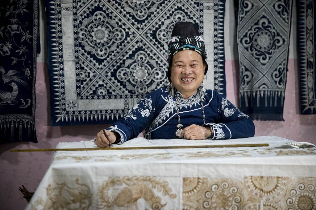 被稱為“東方第一染”的貴州丹寨苗族蠟染作品也遠銷海內外,成為丹寨人民脫貧致富的“好幫手”……