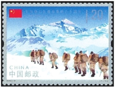 5月25日,中國郵政發行《中國登山隊登頂珠峰六十周年》紀念郵票,全套1枚。面值1.20元。