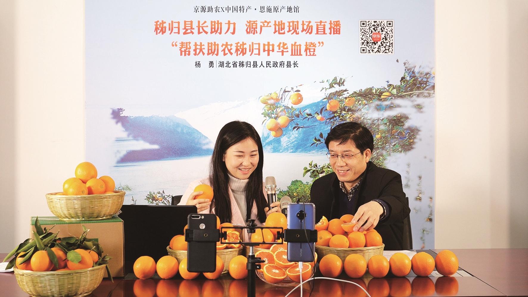 秭歸縣委書(shū)記盧輝(左一)直播帶貨,助力臍橙銷(xiāo)售。