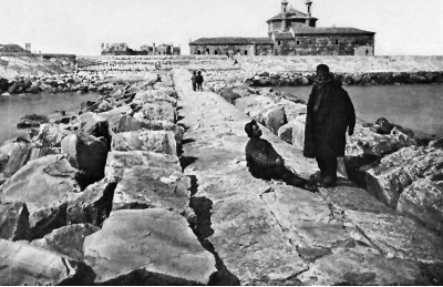 其次,表現在技術和工程層面。中世紀晚期,威尼斯主要采用一種木制沉箱來加固和保護防浪堤的薄弱部分。該沉箱一般由單排或多排的粗壯樹干組成柵欄,鐵索加固并綁成箱狀,裝滿石頭等重物安置于海堤前,以減弱海潮對堤岸的沖擊。但這種沉箱需要耗費大量木材,且安裝和維修成本很高,隨著森林資源日趨緊張,威尼斯人開始尋找新的替代性海防措施。18世紀初,時任治水官貝納迪諾·曾德里尼提出了建設永久海防“穆拉齊”的工程提案。該海防堤由火山灰燒造的巨大人工礁石組成,安裝在利多、佩萊斯特里納等海防群島前,構成一個完整的海防堤岸線。這一提案在1738年經小規模試驗后,迅速得到元老院的肯定和批準。整個工程建設持續了三十余年,直到共和國覆滅仍在繼續進行。直至今日,“穆拉齊”海防仍然在發揮功能。