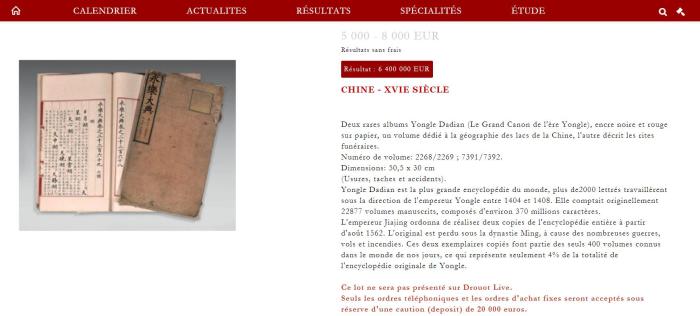 《歐洲時報》稱,當時競拍價已經突破拍賣公司顯示屏的極限,競拍價無法顯示。經過11分鐘的競拍,拍品最終由現場的一位中國女士以640萬歐元的競價拍得,比起拍價溢價了超過1200倍。由于拍賣行傭金為27%,兩冊《永樂大典》最終成交價為8128000歐元(合近6500萬元人民幣)。