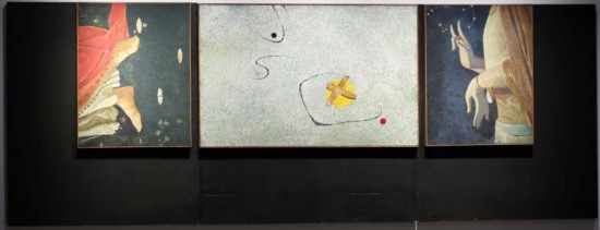 《太和——廿一世紀》是一幅三聯畫。中間的一幅是抽象的,左右兩幅是寫實的。這種表現手法也是藝術家陳創洛借鑒西方后現代表現主義的影響所繪。中間的一幅畫,在無垠的宇宙中,象征地球的一個黃色圓點被紗布貼成“X”形,在它左上方的黑色弧線和小黑點構成了表示呼救的英文縮寫語 “SOS”,而這些線與點在更大范圍內又形成了一個隱隱約約的骷髏頭,這個畫面似乎是在發出一個危險警告,使人能夠體會到內中藏匿的憂患意識。左右兩幅畫分別代表了西方文化和東方文化:右幅截取的是中國菩薩塑像的雙手和身軀,他一手上翹,意示撫慰;另一手下垂,表示祈愿。晴朗的夜空中閃爍著星斗。左幅截取的是意大利文藝復興早期畫家波提切利的《春》中的維納斯的雙腳,草地上盛開著各種小花。陳創洛通過一系列的對比,很有意味地表達了一個深刻的思想——和而不同。文化的不同不應造成為對立和沖突的理由,和諧便是理念上的求同存異。祈求世界和平,倡導生態平衡,改變地球變暖等等,這一切都是畫家創作此畫的出發點。