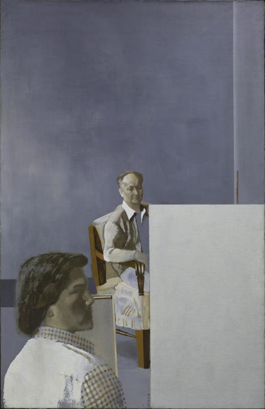 人物肖像畫《部長與我》頗引人注意。畫中的部長,是曾經擔任毛澤東秘書的李銳。畫家夏葆元曾受邀為李銳畫了一幅人物肖像。一年以后,夏葆元根據這件事創作了《部長與我》。20世紀80年代中期,正是國內“新潮美術”興盛之時,各種現代藝術思想、觀念大行其道,《部長與我》顯然受到這樣的現代思潮影響,無論畫面構圖、人物刻畫還是環境氛圍營造,以及流露出的人與人之間的陌生、隔閡以及疏離感,都與此前的現實主義寫實繪畫大不相同。嫻熟概括的運筆,微妙而富有暗示性的色彩,簡潔冷峻帶有構成主義特點的畫風,令此作在當時顯得非常突出并受到較大關注。