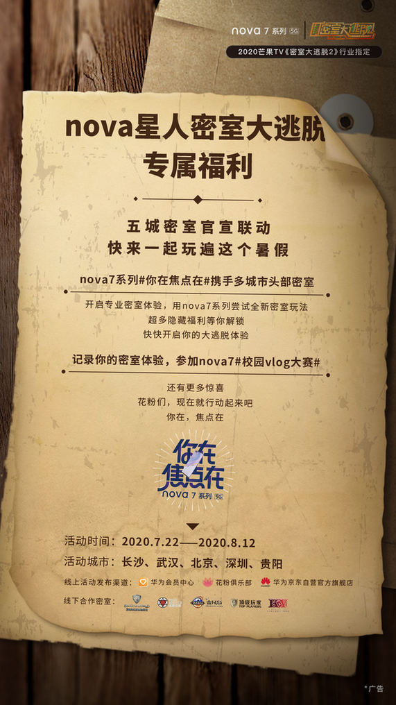 此外,華為nova7系列還與暴風(fēng)島、KY真人密室、迷斯伍德、屋有島等頂級(jí)密室聯(lián)動(dòng),在包含深圳在內(nèi)的長(zhǎng)沙、武漢、北京、貴陽五城開啟全新密室玩法。帶上手機(jī),拍下密室通關(guān)的精彩瞬間,參與nova7#校園vlog大賽#,還能解鎖新福利。