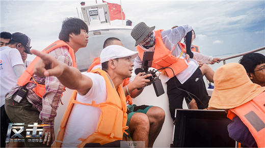 在完成西雙版納叢林拍攝后,劇組全體搭乘飛機、大巴、輪渡前往舟山嵊泗島拍攝,大部隊浩浩蕩蕩感受了“海陸空”轉場的旅途,雖然海島風景優美,但是海上拍攝卻是所有場景里面最困難的,所有設備、人員調度拍攝全在海上,機動性受限制,更有工作人員現場暈船還堅持拍攝。