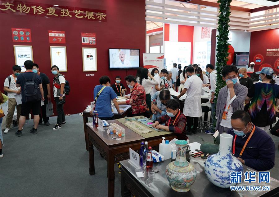 9月8日,觀眾在服貿(mào)會上參觀文物修復(fù)技藝展示。 2020年中國國際服務(wù)貿(mào)易交易會9月4日至9日在北京舉行。在本屆服貿(mào)會文化服務(wù)專題展區(qū),文物修復(fù)專家現(xiàn)場展示文物修復(fù)技藝,讓觀眾近距離感受文物修復(fù)過程。新華社記者 張晨霖 攝