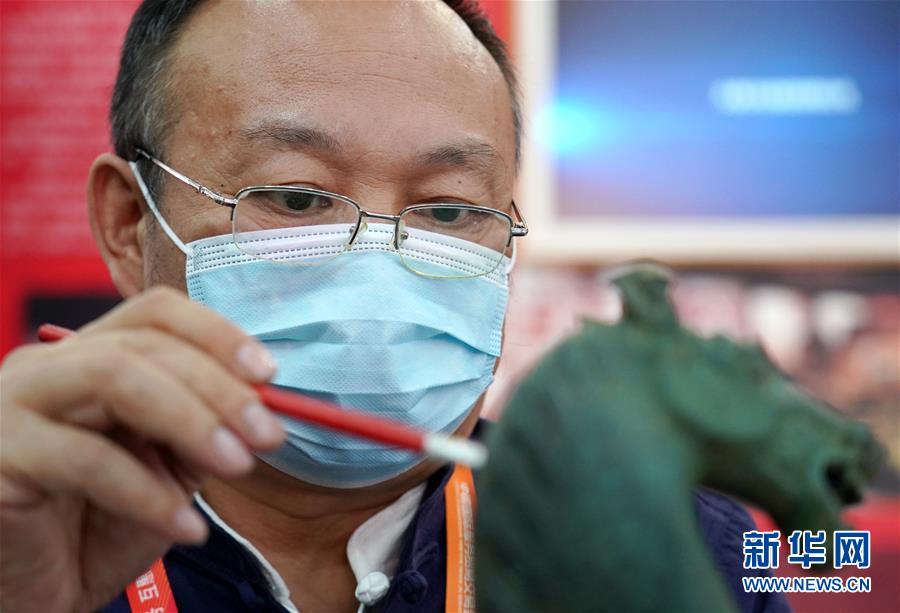 9月8日,文物修復(fù)專家韓松在展示青銅器修復(fù)技藝。 2020年中國國際服務(wù)貿(mào)易交易會9月4日至9日在北京舉行。在本屆服貿(mào)會文化服務(wù)專題展區(qū),文物修復(fù)專家現(xiàn)場展示文物修復(fù)技藝,讓觀眾近距離感受文物修復(fù)過程。新華社記者 張晨霖 攝