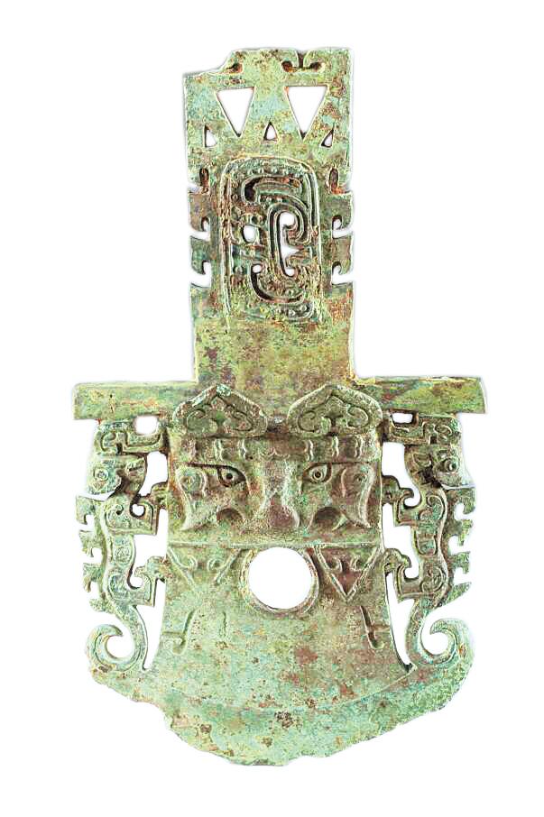 龍紋鉞,斧形,鉞援中部飾獸面紋,兩側飾圓雕龍紋。鉞是商、西周時期高等級貴族身份的象征。