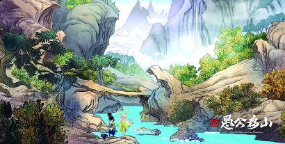 區(qū)別于目前動畫市場上流行的三維大制作,《新愚公移山》選擇了二維手繪風(fēng)格。這一形式的選用除了基于成本把控外,更出于對作品形式與傳統(tǒng)文化氣韻“適配性”的考量。片中作畫感十足的山水背景,承載著宋畫《千里江山圖》的風(fēng)格與意境,讓觀眾眼前一亮。此外,影片在配樂中也大量運用了傳統(tǒng)戲曲元素。中國風(fēng)濃郁的視聽效果,配上當(dāng)代性的創(chuàng)新解讀,讓作品洋溢著濃濃的“國潮”質(zhì)感。