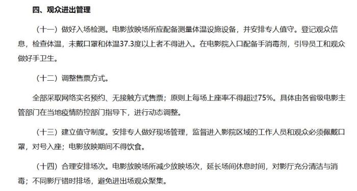 需要指出的是,雖然影院上座率上調(diào)到75%,但具體由各省級電影主管部門在當(dāng)?shù)匾咔榉揽夭块T指導(dǎo)下,進(jìn)行動態(tài)調(diào)整。對觀眾而言,仍需要采用網(wǎng)絡(luò)實名預(yù)約、無接觸方式購票,在觀影過程中也需要遵守防疫規(guī)定,如登記、查體溫、觀影過程中佩戴口罩等等。