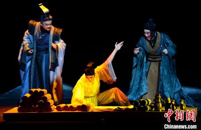 話劇《孔子》在創(chuàng)編過程中采用多種現代藝術表現手法。圖為,在劇情中穿插了司馬遷糾結于如何書寫孔子誅殺少正卯的傳說。 邱江波攝