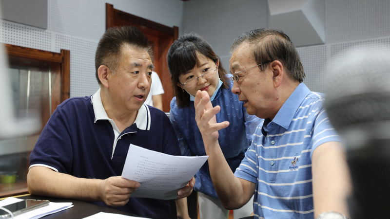 △9月6日總導演閆東(左)在錄音棚與合作30余年的作曲家劉為光(右)和音樂編輯(毛薇薇)討論主題曲錄制細節。