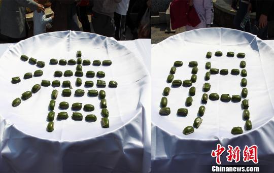 資料圖:圖為清明粑組合擺放成“清明”兩個(gè)字(拼圖)。 楊孝勇攝