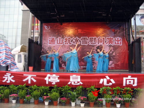 本網(wǎng)訊 昨日下午,冰雪災(zāi)害之后的第一場大雨,天氣格外寒冷,可在通山縣鳳池廣場,卻洋溢著陣陣暖流,湖北廣播電視總臺影視頻道帶著對災(zāi)區(qū)人民的牽掛和祝福,冒雨來到通山慰問演出,得到了通山人民的熱烈歡迎。