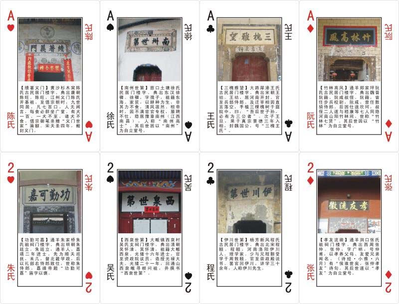 通山門(mén)樓文化撲克一副共55張,除1張癩子說(shuō)明,2張大小王分別為“九宮山”“大幕山”旅游景點(diǎn)門(mén)樓字圖片外,其余每張1個(gè)姓氏對(duì)應(yīng)1幅門(mén)樓字圖片。一副撲克牌中的52姓編排順序按《通山縣志》(2005年版)姓氏序號(hào)進(jìn)行。各姓氏的門(mén)樓字圖片或?yàn)槊窬印⒒驗(yàn)殪籼谩⒒驗(yàn)榕品弧D片下面的文字解釋門(mén)樓的來(lái)歷。