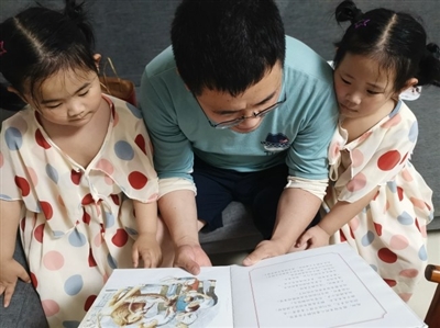 12日,晚飯過后,咸安區(qū)尚書名府小區(qū)章皖昭小朋友的家里,章爸爸正在給章皖昭和妹妹分享繪本《圖書館獅子》。