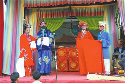 看,演員登臺擺起架勢,一鼓,一鑼,一梆子,自敲自唱,正是“不托管弦,人聲幫腔”的老式演唱。聽,唱的是《梁山伯與祝英臺》中的一折戲:清瘦的“梁山伯”的嗓子尤其清亮,跌宕起伏,游刃有余。